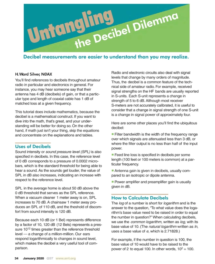 The winning article for the January 2020 QST Cover Plaque award is “Untangling the Decibel Dilemma” by H. Ward Silver, NØAX.
