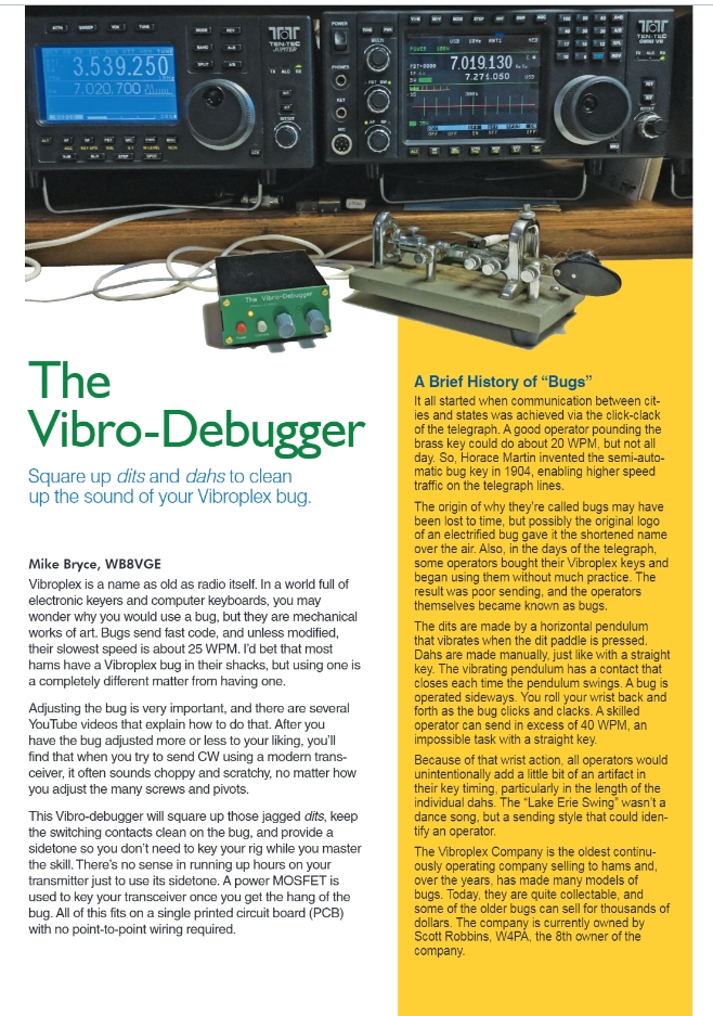 The winning article for the July 2019 QST Cover Plaque award is “The Vibro-Debugger” by Mike Bryce, WB8VGE.
