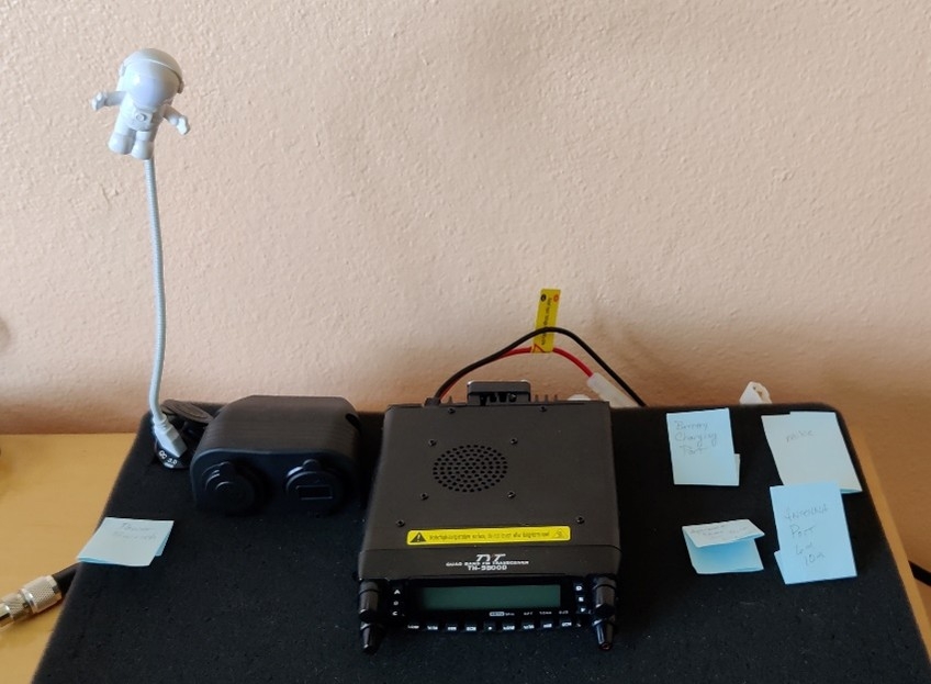 The magnetic mic mount I selected didn’t fit the TYT radio. Fortunately, a friend 3D-printed me an adapter that works perfectly. This shack-in-a-box stands in my ham shack/office, ready for use!