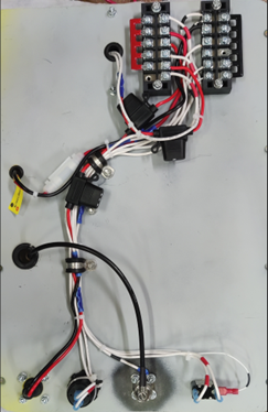 The next photo shows the in-line fuse boxes. The wire clamps are held by the same bolts securing the radio. We swapped out shorter screws for some that were just a little longer to accommodate the clamps. Everything is secured. The grommets in the holes will keep the wires from chafing as they pass through the panel.
