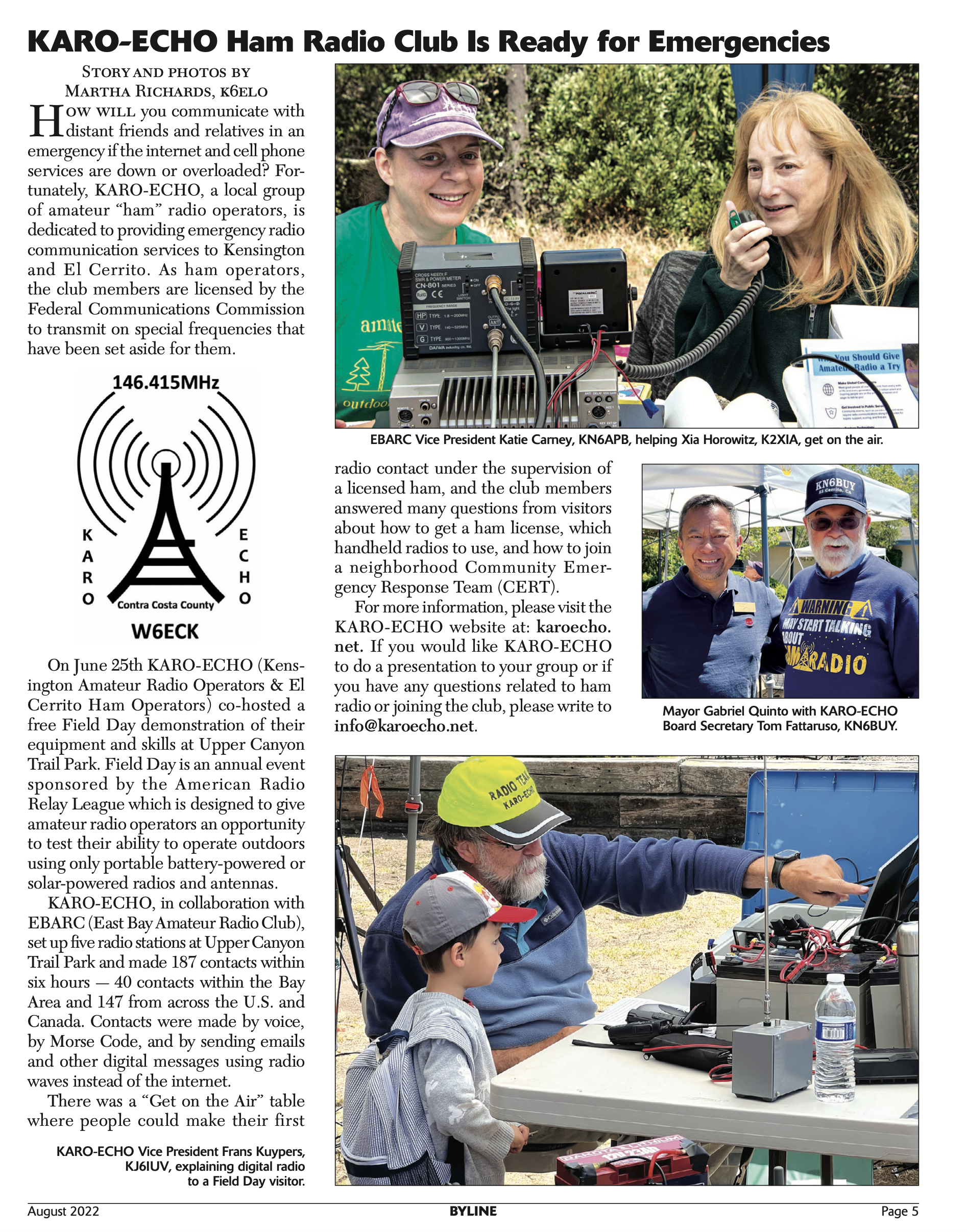 Although our focus is on Kensington and El Cerrito, all are welcome to train with us. KARO ECHO provides hands-on practical training and biannual Simulated Emergency Tests (SETs) emphasizing best practices.For more please visit  https://www.karoecho.net