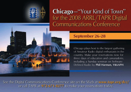 Aficionados of digital communications are gearing up for the 27th annual ARRL/TAPR Digital Communications Conference (DCC) September 26-28 in Chicago, Illinois. The ARRL/TAPR Digital Communications Conference is an international forum for radio amateurs to meet, publish their work and present new ideas and techniques. Presenters and attendees will have the opportunity to exchange ideas and learn about recent hardware and software advances, theories, experimental results, and practical applications. The DCC is for all levels of technical experience -- not just for the expert. Not only is the conference technically stimulating, it is a weekend of fun for all who have more than a casual interest in any aspect of amateur digital electronics and communications; introductory sessions are scheduled throughout the conference to introduce new technical topics for both beginners and experts.