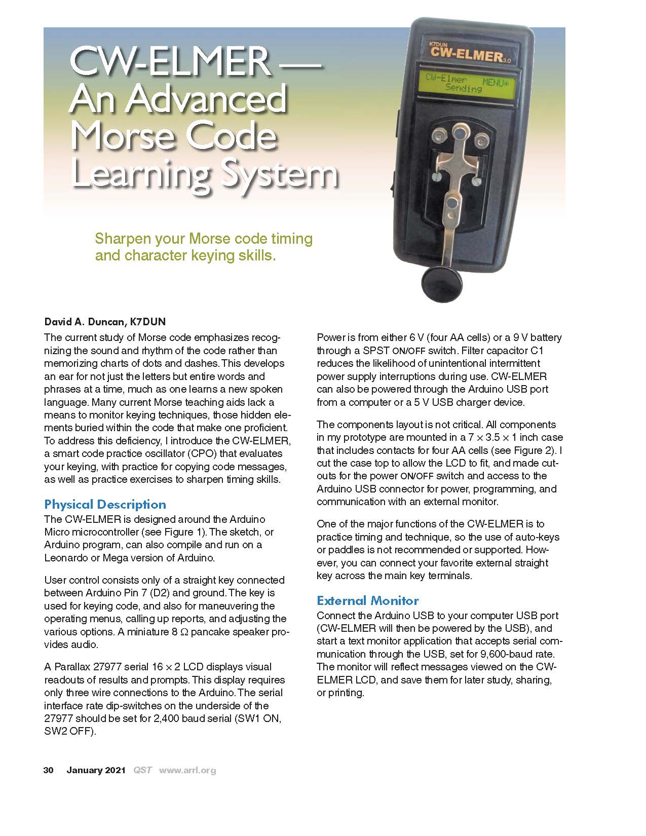 The winning article for the January 2021 QST Cover Plaque award is “CW-ELMER – An Advanced Morse Code Learning System,” by David A. Duncan, K7DUN.