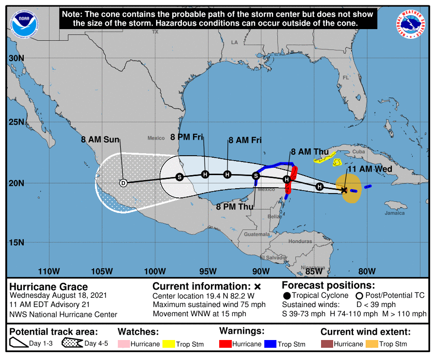 The National Hurricane Center predicts that Hurricane Grace will follow a west to northwest to westward motion for the next several days. Some additional strengthening is expected before the storm’s center reaches the eastern Yucatan Peninsula before weakening over land. Grace is expected to regain strength as it moves over the southwestern Gulf of Mexico on Friday. Hurricane-force winds extend outward up to 25 miles from the storm’s center, and tropical-storm-force winds extend outward up to 115 miles.