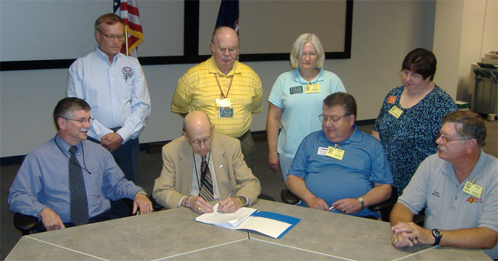 ![State Coordinator of the Virginia Department of Emergency Management Michael M. Cline (bottom left) watches State RACES Officer Mac McNeer, K4YEF, sign the new MOU between the Virginia Department of Emergency Management and Virginias ARRL Section. Next to McNeer is Virginia SEC Ron Sokol, K4KHZ and Virginia Section Manager Carl Clements, W4CAC. Back row, left to right: EOC Deputy Chief Operations Plans Section Terry Hebert, KG4GLS; Virginia Public Information Coordinator Joe Safranek, K4JJS; Virginia Assistant Section Manager Christine Sokol, K4CES, and Joy Safranek, W2JMS. [Photo Courtesy of Joe Safranek, K4JJS]](/img/130x97/exact/News/nms_300.jpg)