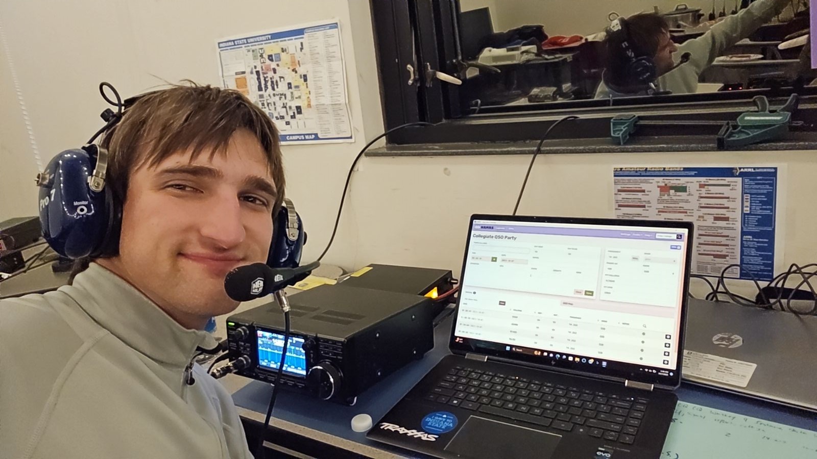 The club has faced challenges in recent months, including being displaced due to campus renovations and having minimal student involvement; they didn't even have a multimode, multiband transceiver. In an effort to boost interest and attention to amateur radio, Faculty Advisor Dr. Robert Girod, N9RNV, offered 10% extra credit to students who earned their Technician-class amateur radio license. That incentive, along with efforts from student leader and W9ISU President Rowan Eggert, WO1P, helped turn things around. The club received a grant from the school that allowed them to purchase three stations, Icom IC-7300s with Heil Pro 7 headsets, foot switches, and antennas. The gear made it possible for them to set a goal of having everything up and running for the 48 hours of the ARRL Collegiate QSO Party.