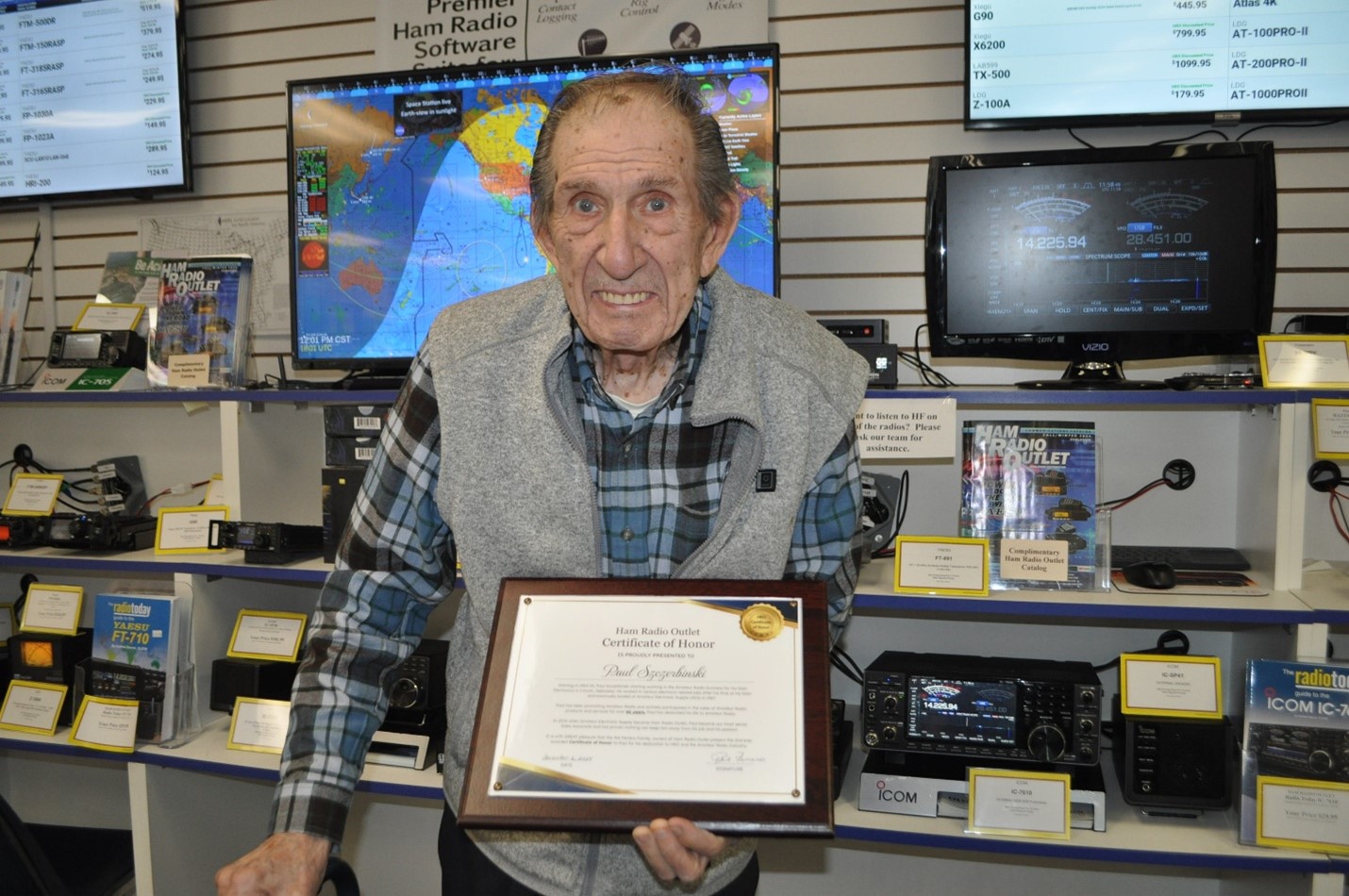 Paul Szczerbinski, W9KHO, an employee of Ham Radio Outlet in Milwaukee, Wisconsin, received a Certificate of Honor from HRO President Robert Ferrero, W6KR, for 60 years as an amateur radio operator. This is just the second time the award has been presented.