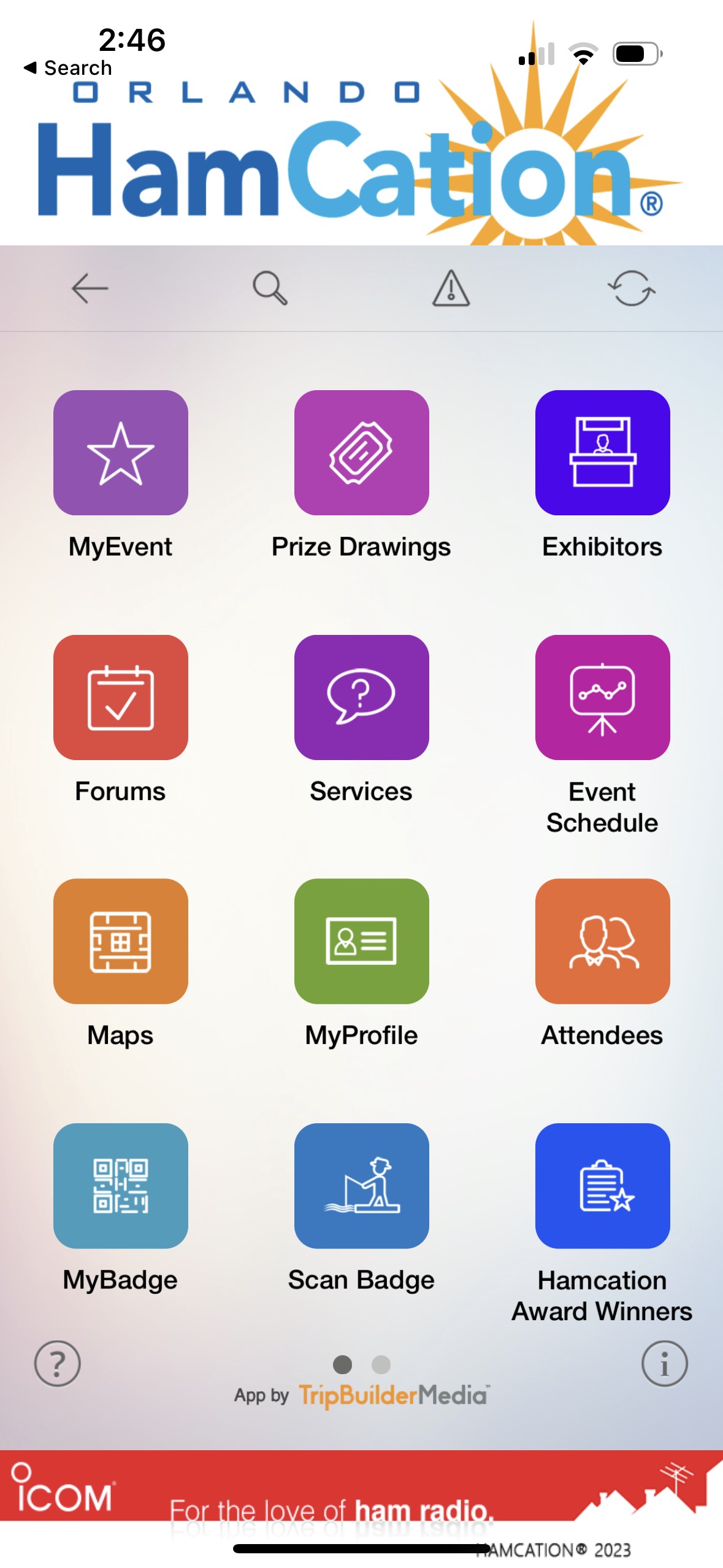 While returning app users do not have to re-register to use the app, they will be prompted to complete a simple registration to view each new event. Attendees are also encouraged to tap on the MyProfile icon in the app to add their name and call sign, email address, and any additional information they would like to share with other HamCation guests. Additionally, the MyBadge icon displays a QR code of your event badge that can be scanned by another attendee or exhibitor using the Scan Badge icon - instantly connecting shared contact information with other hams at the event.