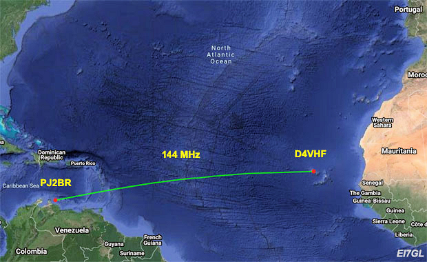 “The incredible tropo conditions between Cape Verde Islands and the Caribbean continue to amaze with transatlantic contacts on 144 MHz and 432 MHz being made,” John Desmond, EI7GL, said in a blog post. The April 8 FT8 contact was between D4VHF in the Cape Verde Islands and PJ2BR on Curacao. The distance covered was some 300 kilometers greater than the previous transatlantic record, set last summer by D41CV and NP4BM.