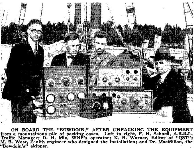 M.B. West, an ARRL Board member, designed the gear, which was then built by amateurs at his firm, Zenith Electronics. The transmitter operated on the medium-wave bands of 185, 220, and 300 meters, running 100 W to a pair of Western Electric “G” tubes. Earlier exploratory missions had used gear that operated on longwave frequencies. The shipboard station on board the Bowdoin was given the call sign WNP — Wireless North Pole.