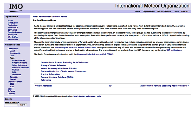 I used a roof-mounted Antennacraft CCS-1843, 180-inch boom length, extreme deep fringe cross-phase multi-element U/V/FM antenna that is 25 feet above the ground aimed north-northwest, with 50 feet of RG-6 quad coax cable terminated to a Visteon HD Jump FM RDS radio set in analog mode. I didn’t use an antenna preamplifier; however, if you wish to achieve more efficiency, thereby increasing meteor detection rates, obtain a low-noise, medium-to-high gain (10-20 dB) antenna preamplifier and mount it as close to the antenna feedpoint as possible.