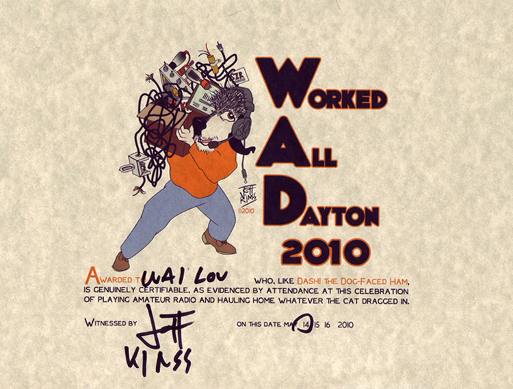 Jeff's booth featured his new book, Sky Buddies, which, by the way, is as enjoyable as his first book; he also had some cool freebies to giveaway to promote his product. One freebie was a Worked All Dayton certificate awarded to anyone “who, like Dash! the dog-faced ham, is genuinely certifiable as evidenced by attendance at this celebration of playing Amateur Radio and hauling home whatever the cat dragged in.” Keeping in the spirit of the Dashtoons canine theme, another freebie that Jeff proffered was a sequentially-numbered dog bone insulator!