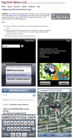 Dog Park Software Ltd just released CallBook for iPhone and iPod Touch that allows you to look up call signs via the free WM7D.net server, the QRZ Online subscription service or the HamCall subscription server. You can e-mail the results and view the looked-up QTH in the iPhone's Maps application.