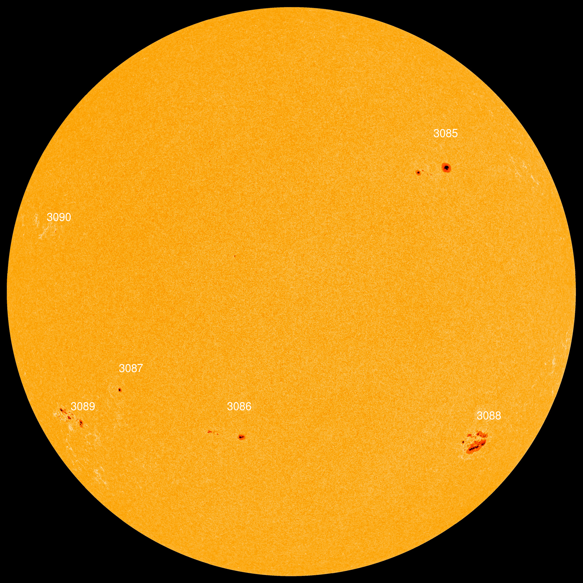 "Sunspot AR3085 grew more than ten times larger and turned into a double sunspot group with cores almost as wide as the Earth. Finally, a new sunspot, AR3088, appeared, again in the southern hemisphere of the Sun.