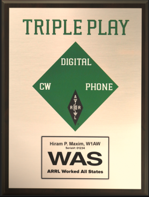 - Plaques: Now is your chance to proudly display your accomplishment of achieving the WAS Triple Play award with a distinctive wall plaque to display next to your certificate! Two plaque stles are available: Wood 9"x12", offering a handsome warm presentation to match other wood plaques you have earned; else the Acrylic plaque option which is a replica of the Triple Play award certificate laminated in plexiglass. Both include your callsign, award date and award number.